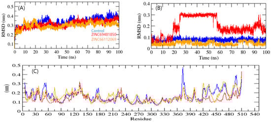 Complex structural stability studies. Protein backbone RMSD (A), Ligand RMSD plot (B), and RMSF of proteins (C). Control, ZINC69481850, and ZINC66112069 were shown in blue, red, and orange colors, respectively.