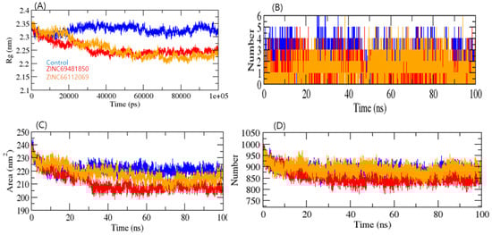 Radius of gyration of complexes (A), Number of H-Bonds in complexes (B), SASA plot (C), and Number of H-Bonds between RdRp and water molecules (D). PPNDS, ZINC69481850, and ZINC66112069 were shown in blue, red, and orange colors, respectively.