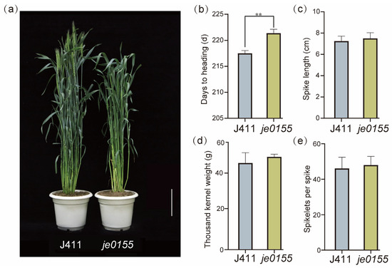 Comparison of phenotype and yield-related traits between WT and mutant: (a) Phenotypic comparison between WT (Jing411) and late heading mutant je0155. Plants were grown under field conditions and the picture was taken when the WT was heading. Bars = 10 cm; (b) Days to heading; (c) Spike length; (d) Thousand kernel weight; (e) Spikelets per spike. Values are averaged from five replicates. ** indicates significant differences by t-test at p < 0.01.