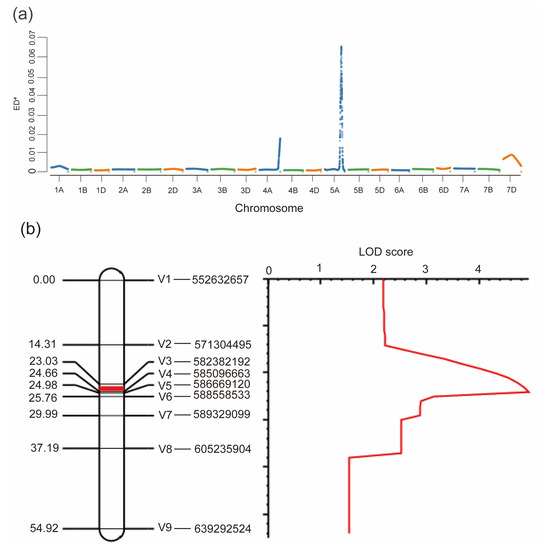 Mapping of the HD gene by BSA and genetic linkage analysis: (a) Distribution of ED4 values across all chromosomes. Higher ED4 values indicate a higher association effect with HD; (b) QTL analysis of HD on chromosome 5A. The logarithm of odds (LOD) threshold was set to 3.0, and a QTL located on a 1.63 cM of genetic linkage map between markers V3 and V4 was identified.