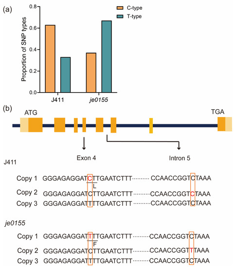 Copy number and mutation analysis of VRN-A1 in je0155: (a) The ratio of C- and T-type alleles of exon 4 in WT and je0155; (b) Gene structure and sequence of three copies of VRN-A1 with mutations in exon 4 and intron 5 of different copies of VRN-A1 in je0155. The light orange boxes indicate the 5′ or 3′ UTR region, while the orange boxes indicate the exon regions. The red fonts represent the mutation site in J411 and je0155.