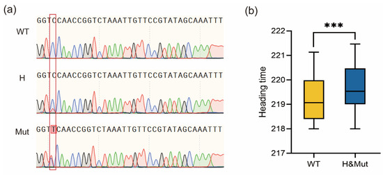 Development of PCR sequencing markers and the phenotypic analysis of the F2:3 population: (a) Sequences of different genotypes of mutations in intron 5 from the F2 population detected by Sanger sequencing markers. The red box represents different peaks detected by Sanger sequencing in the population; (b) Heading time comparison of F2:3 lines genotyped by PCR sequencing markers. WT, H, and Mut indicate homozygous WT, heterozygous, and homozygous mutant genotypes, respectively. *** indicates significant differences at 0.001 level by t-test.