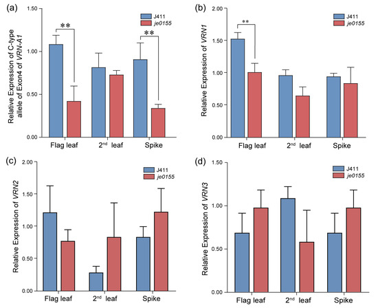 Real-time qPCR of vernalization genes in WT and je0155. Values are means ± SD from five biological replicates. Second leaf indicates the second leaf below the spike: (a) Expression of C-type allele of exon 4 of VRN-A1 in the flag leaf, the second leaf, and the young spike of WT and je0155; (b–d) Relative expression of VRN1 (b), VRN2 (c), and VRN3 (d). ** represents a significant difference at 0.01 level by t-test.