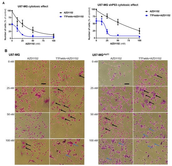 2.1. Treatment of U87-MG and U87-MGshp53 with AZD1152 and TTFields Increases Cell Death