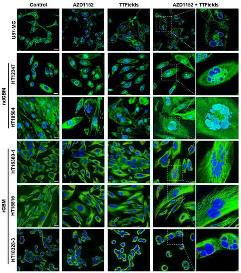 2.4. AZD1152 plus TTFields Reinforce Morphological Changes in ndGBM and rGBM Primary Cultures