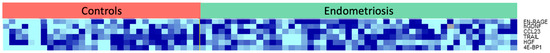 - Perricos, A.; Wenzl, R.; Husslein, H.; Eiwegger, T.; Gstoettner, M.; Weinhaeusel, A.; Beikircher, G.; Kuessel, L. Does the Use of the “Proseek® Multiplex Oncology I Panel” on Peritoneal Fluid Allow a Better Insight in the Pathophysiology of Endometriosis, and in Particular Deep-Infiltrating Endometriosis? J. Clin. Med. 2020, 9, 2009. [Google Scholar] [CrossRef]