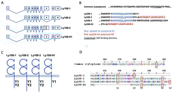 Searching the PhosphoSitePlus database with the tails of Ly108 isoforms showed, in addition to the described ITSMs, various tyrosines assigned as putative phosphorylation sites [44]. Additional differences in protein binding motifs are shown in Supplementary Figure S1. When comparing these predictions, it remains apparent that the most striking difference with regards to phosphorylation resides in the absence of the second ITSM in Ly108-H1. For this reason, we proceeded to compare Ly108-H1 with this previously studied Ly108-1 and Ly108-2.