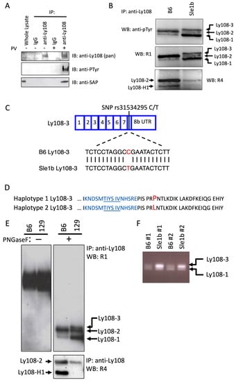 We took two approaches to compare phosphorylation as well as detect Ly108-3. First, based on previous findings and predictions, we knew that Ly108-3 could be phosphorylated and, therefore, detected using an anti-phosphotyrosine antibody [22]. Second, alignment of the amino acid sequences, together with the targets of our previously generated polyclonal antibodies shown in Figure 1B, lead us to believe that Ly108-3 should also be detectable with antibody R1 (Figure 1B, target shown in blue). R1 had initially been generated to detect Ly108-1 and Ly108-2, but Ly108-3 contains an identical target sequence and is very similar in molecular weight to Ly108-2 (39.1 vs. 38.6 kDa, respectively). Both strategies required pervanadate treatment, as well as deglycosylation and additional separation of isoforms by SDS-PAGE. In the top panel of Figure 4B, three bands of phosphorylated Ly108 are visible in the lane from Sle1b mice. Three corresponding bands are also visible in the middle panel of membranes re-probed with R1 and correspond with Ly108-1, Ly108-2, and Ly108-3, as indicated. As expected, re-probing with R4 in the lower panel resulted in only one band (Ly108-2) in Sle1b mice and two bands (Ly108-H1 and Ly108-2) in B6 mice. Consistent with previous studies, Ly108-1 is the most heavily phosphorylated, followed by Ly108-3 and then Ly108-2 [22,36]. Ly108-H1 phosphorylation in this experiment is not clearly seen (Figure 4B, top panel), but barely visible on the original films, which is also consistent with previous findings [36].