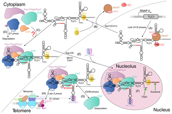 Although there is no experimental evidence to support this supposition, the newly synthesized TLC1 is most likely bound by the cap-binding complex (CBC) and transcription–export complex 1 (TREX-1), as is the case for other m7G-capped RNAs [55,56]. These complexes are thought to provide assistance during the early steps of TLC1 maturation, including the recruitment of the Xpo1 exportin. Data suggest that TLC1 cytoplasmic export is entirely dependent on Xpo1 [23,57]. However, the export receptor heterodimer Mex67-Mtr2 likely serves as an adaptor during export and a stabilizer of RNA, as in mex67-5 mutants cells, TLC1 is rapidly degraded by the nuclear exosome [23,58].