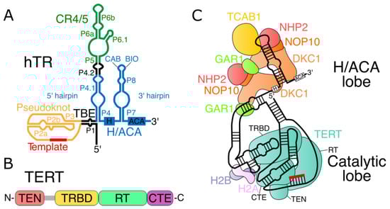 Human telomerase RNA (hTR) and human TERT (hTERT) are sufficient for the generation of telomerase activity in vitro in rabbit reticulocyte lysate, which provides accessory proteins for the assembly of the telomerase complex [20,21]. However, the effective functioning of the telomerase complex in vivo requires many additional proteins [123]. Thus, we briefly consider the secondary structure of telomerase RNA and the domain organization of telomerase reverse transcriptase (Figure 3A,B). For more details on the structure of the human telomerase holoenzyme (Figure 3C), the reader may refer to a recent review [124].