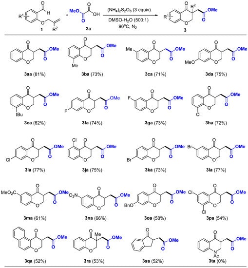 Initially, a model reaction of 2-(allyloxy)benzaldehyde (1a) and 2-methoxy-2-oxoacetic acid (2a) was carried out to investigate the reaction conditions (Table 1). When the reaction was performed in DMSO at 80 °C under N2 atmosphere for 24 h employing (NH4)2S2O8 (3 equiv.) as the oxidant, the desired product, methyl 2-(4-oxochroman-3-yl)acetate (3aa), was obtained in 71% isolated yield (entry 1). Inspired by the above result, some other common solvents including DMF, CH3CN, DCE, THF and H2O were also screened. To our surprise, only DMSO was efficient for the present transformation and no desired 3aa was observed with other examined solvents (entries 2–6). Furthermore, several mixed solvents consisting of different volume ratios of DMSO and H2O were tested (entries 7–10). The results revealed that a trace amount of H2O was more efficient for the current reaction (entry 7 vs. entry 1), and 3aa was isolated with 76% yield in DMSO/H2O (500:1). Next, various oxidants including K2S2O8, Na2S2O8, TBHP, Selectfluor and PhI(OAc)2 were also investigated (entries 11–15). In sharp contrast to (NH4)2S2O8, no desired product 3aa was detected with the other examined oxidants. Moreover, the influence of reaction temperature to the reaction was then tested. Elevating the temperature from 80 °C to 90 °C, the yield of 3aa increased from 76% to 81% (entry 16 vs. entry 7); further raising the temperature to 100 °C gave a slightly reduced yield of 3aa (entry 17). When the reaction temperature was reduced from 90 °C to 70 °C, 3aa was obtained with an obviously decreasing yield (entry 18). In addition, reducing the amount of (NH4)2S2O8 or 2a to 2 equiv. (based on 1a), the desired 3aa was obtained in 57 and 64% yields, respectively (entries 19–20). Moreover, in the absence of any oxidant, no reaction occurred, suggesting that oxidant was crucial for the current reaction (entry 21).