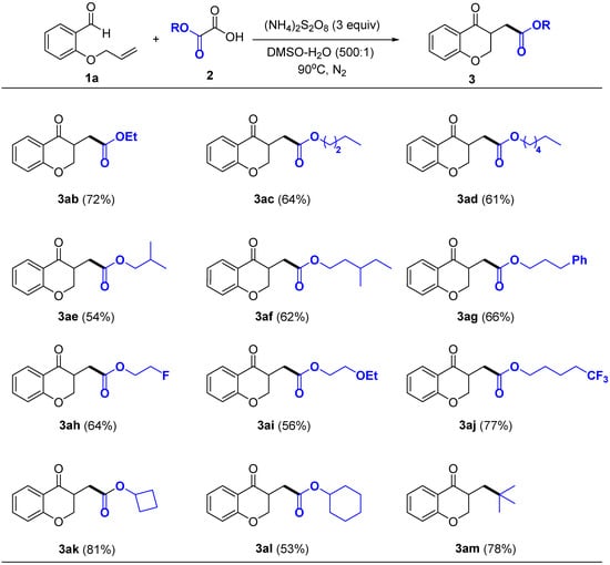 On the other hand, chroman-4-ones are among the ubiquitous structural motifs that occur in natural products, pharmaceuticals and biologically active compounds. They exhibit a variety of physiological and biological activities, such as antibacterial, antioxidant, anti-HIV, and SIRT2 inhibiting properties [,,,,]. For example, 8-bromo-6-chloro-2-pentylchroman-4-one was selected as a potent inhibitor of SIRT2 with an IC50 of 1.5 μM in a reported work in the literature []. In the past few years, various radical cascade annulation reactions of 2-(allyloxy)arylaldehydes triggered by diverse radicals, such as alkyl, acyl, phosphoryl, trifluoromethyl and sulfonyl, for the synthesis of valuable chroman-4-one derivatives have been well established (Scheme 1a) [,,,,,,,,,,,]. Nevertheless, to the best of our knowledge, an alkoxycarbonyl radical triggered cascade radical cyclization to synthesize ester-functionalized chroman-4-ones has never been reported. Herein, we disclose a (NH4)2S2O8-mediated protocol for the selective intramolecular decarboxylative radical cyclization of 2-(allyloxy)arylaldehydes with oxalates for the rapid building of a variety of ester-containing alkyl-substituted chroman-4-ones (Scheme 1b). It is worth mentioning that oxalates can be easily obtained via the condensation of readily available alcohols and oxalyl chloride, followed by in situ hydrolysis without tedious column chromatography, making the present method much more practical and attractive to give various ester-containing chroman-4-ones.
