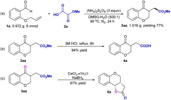 - Xie, L.-Y.; Peng, S.; Yang, L.-H.; Liu, X.-W. Metal-Free Synthesis of Carbamoylated Chroman-4-Ones via Cascade Radical Annulation of 2-(Allyloxy)arylaldehydes with Oxamic Acids. Molecules 2022, 27, 7049. [Google Scholar] [CrossRef] [PubMed]