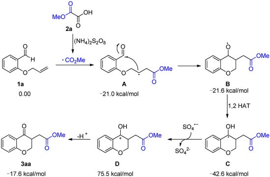 Based on the density functional theory (DFT) calculations (for details, see the Supporting Information), our preliminary control experiments and the relevant reports from the literature [,,], we speculated a possible reaction pathway, as shown in Scheme 6. First, a radical anion SO4−• generates via the decomposition of (NH4)2S2O8 in DMSO; meanwhile, SO4−• captures a hydrogen atom from 2-methoxy-2-oxoacetic acid (2a) to form a methyl ester radical via a decarboxylative process. Then, the methyl ester radical attacks the C=C bond of 1a to give radical intermediate A (−21.0 kcal/mol), which undergoes further cyclization to afford an oxygen radical B (−21.6 kcal/mol). The radical B then undergoes a 1,2-hydrogen atom transfer (HAT) process to afford radical C (−42.6 kcal/mol). Furthermore, in the presence of radical anion SO4−•, the intermediate C is transformed to a carbocation intermediate D (75.5 kcal/mol); the activation free energy of this process is 118.1 kcal/mol (C→D), which might be the rate-determining step. Finally, a favorable deprotonation process occurs to deliver the desired product 3aa (−17.6 kcal/mol).