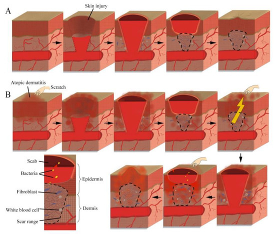 Schematic diagram of epidermal barrier recovery. (A) Epidermal barrier recovery due to physical skin damage. (B) Epidermal barrier recovery due to a lesion from atopic dermatitis.