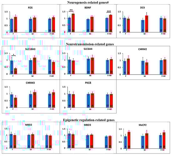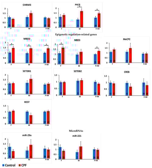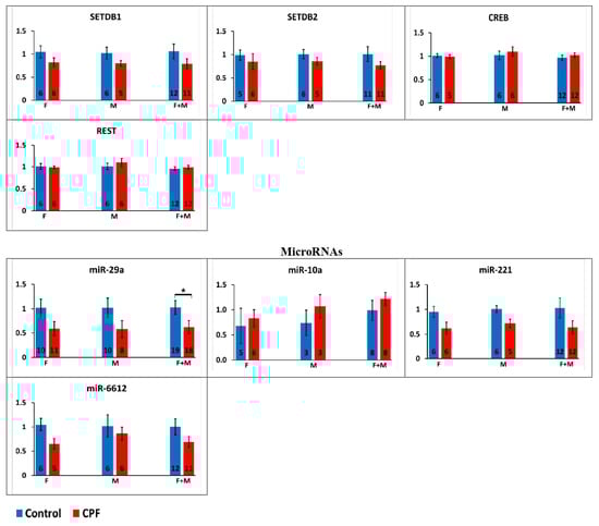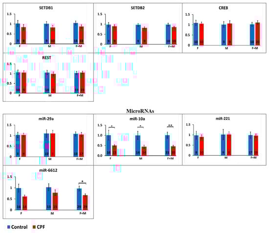 Effects of paternal exposure to chlorpyrifos (CPF) on the offspring’s gene expression. Relative gene expression results obtained in the offspring after paternal exposure to chlorpyrifos. M: male offspring, F: female offspring. Number of samples (n) is presented inside each column. Results are presented as the mean ± SEM. #: PKCß, which is related to both neurogenesis and neurotransmission genes, is presented in the neurotransmission section. *: p < 0.05, **: p < 0.005 and ***: p < 0.0005. PKCß: protein kinase C beta, BDNF: brain-derived neurotrophic factor, FOS: C-Fos, DCX: doublecortin, CHRM2 and CHRM3: muscarinic receptors 2 and 3, SLC18A3: solute carrier family 18 member A3, SLC6A4: solute carrier family 6 member 4, MeCP2: methyl CpG binding protein 2, MBD2 and MBD3: methyl-CpG-binding domain proteins 2 and 3, SETDB1 and SETDB2: SET domain bifurcated histone lysine methyltransferase 1 and 2, CREB: cAMP-response element binding protein, REST: RE1 silencing transcription factor, miR-221: microRNA 221, miR-29a: microRNA 29a, miR-6612: microRNA 6612 and miR-10a: microRNA 10a.