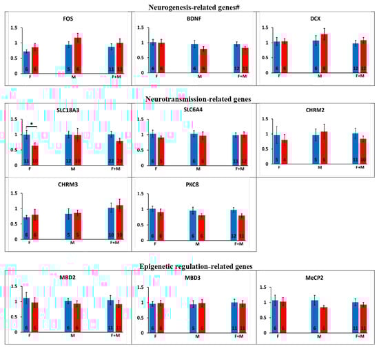 Effects of pre-hatch exposure to chlorpyrifos (CPF) on the offspring’s gene expression. Relative gene expression results obtained in the offspring after pre-hatch exposure to chlorpyrifos. M: male offspring, F: female offspring. Number of samples (n) is presented inside each column. Results are presented as the mean ± SEM. #: PKCß, which is related to both neurogenesis and neutransmission genes, is presented in the neurotransmission section. *: p < 0.05. For genes abbreviations, please refer to Figure 1.