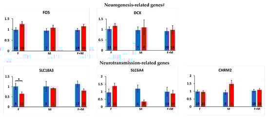 Effects of maternal preconception exposure to chlorpyrifos (CPF) on the offspring’s gene expression. Relative gene expression results obtained in the offspring after pre-hatch exposure to chlorpyrifos. M: male offspring, F: female offspring. Number of samples (n) is presented inside each column. Results are presented as the mean ± SEM. #: PKCß, which is related to both neurogenesis and neurotransmission genes, is presented in the neurotransmission section. *: p < 0.05. For genes abbreviations, please refer to Figure 1.