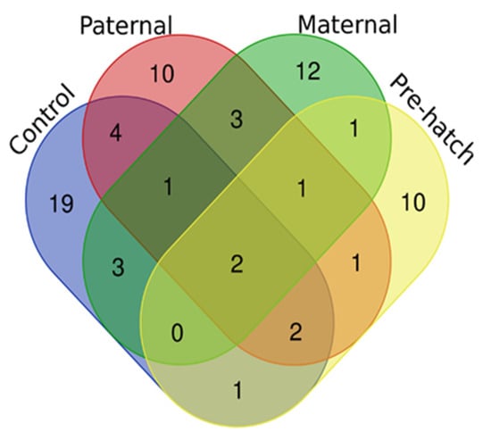 Venn diagram representing shared and non-shared gene expression correlation pairs in the control and chlorpyrifos exposed (paternally, maternally and pre-hatch) offspring.