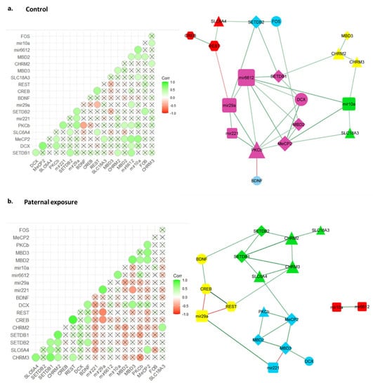 In paternally exposed offspring, two central six-node modules were detected. Module 3 corresponded to the main module in the controls (module 5) and shared four nodes with it (DCX, PKCß, miR-221 and MeCP2), with MDB3 replacing MDB2. Module 4 connected all neurotransmitter-related genes with the chromatin modifiers (SETDB1 and SETDB2) (Figure 5b). Among all correlations found in paternally exposed offspring, only 5 out of 24 involved microRNAs, a rate significantly lower (X2, p < 0.05) than that observed in the controls (15 of 32).