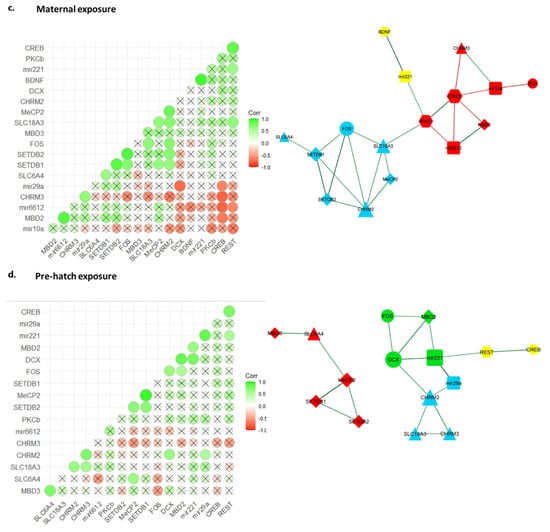Gene co-expression correlation matrix and network in the offspring of the control (a), paternally (b), maternally (c), and pre-hatch (d) chlorpyrifos-exposed chickens. In the left panel, a correlation matrix between the different genes. Non-statistically significant correlations are marked in x. In the right panel, correlation networks between the genes represented as nodes and their correlation as edges. Node size represents the number of connecting edges of the network; only statistically significant correlations were considered. Detected modules (nodes communities) are stained with different colors. Module 1—red, Module 2—yellow, Module 3—light blue, Module 4—green and Module 5—purple. In both panels, edges and correlation color intensity signifies an increased correlation, with green for positive correlations and red for negative correlations.