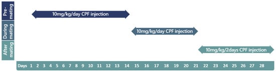 The duration of paternal exposure to chlorpyrifos was selected based on previous studies, which indicates that the spermatogenesis duration is approximately 14 days in most avian models, including the chicken model [,,,], and, consequently, was intended to affect sperm cells. Accordingly, we exposed the males to chlorpyrifos for two weeks before mating with females.