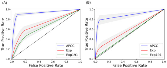 ROC curves of three types of features in predicting metastasis of COAD in independent testing. (A) Average ROC curves in predicting lymph node metastasis of COAD. (B) Average ROC curves in predicting distant metastasis of COAD. PCC: PCC of miRNA–RNA pairs, Exp: Expressions of genes involved in miRNA–RNA pairs, Exp191: Expressions of 191 metastasis-predictive genes [19]. The curves are the average ROC curves of 10 runs. The gray part indicates the error range of the ROC curves.
