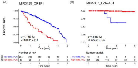 where = 1 if j is uncensored, and 0 otherwise. = 1 if , and 0 otherwise. The C-index ranges between 0 and 1, 1 being the best value. We also performed the log–rank test for each miRNA–RNA pair. When dividing patient samples into two groups (high group and low group), we used the cutp function in the R package survMisc [39]. The cutp function determines an optimal cut point for a continuous variable based on the statistical results of the Cox regression analysis. We adjusted the p-values of the log–rank test using the Benjamini–Hochberg procedure [40], and selected the miRNA–RNA pairs with an adjusted p-value < 0.01 as potential prognostic miRNA–RNA pairs.
