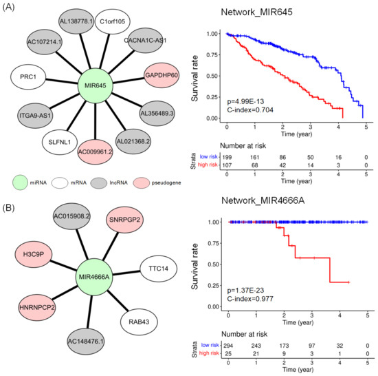Figure 3 shows the network biomarkers for LUAD and PRAD and the results of a survival analysis with the network biomarkers. The network_MIR645 (Figure 3A) consisting of 12 nodes (1 miRNA, 3 mRNAs, 6 lncRNAs, and 2 pseudogenes) revealed the lowest p-value in the log–rank test in LUAD. The network_MIR4666A (Figure 3B) includes 8 nodes (1 miRNA, 2 mRNAs, 2 lncRNAs, and 3 pseudogenes) showed the lowest p-value in the log–rank test and the highest C-index in PRAD. Detailed results of survival analysis with potential prognostic networks are available in Appendix C.