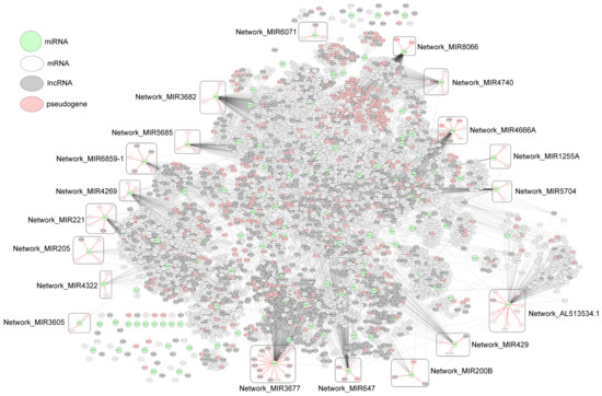 As an example of miRNA–RNA correlation networks, Figure 4 shows a network composed of the miRNA–RNA pairs left after the Wilcoxon test in PRAD. The network consists of 5036 edges between 4121 nodes (125 miRNAs, 2330 mRNAs, 1169 lncRNAs, and 479 pseudogenes), and each edge represents PCC of a miRNA–RNA pair. In the network, 19 potential prognostic network biomarkers of PRAD are enclosed with rounded boxes.