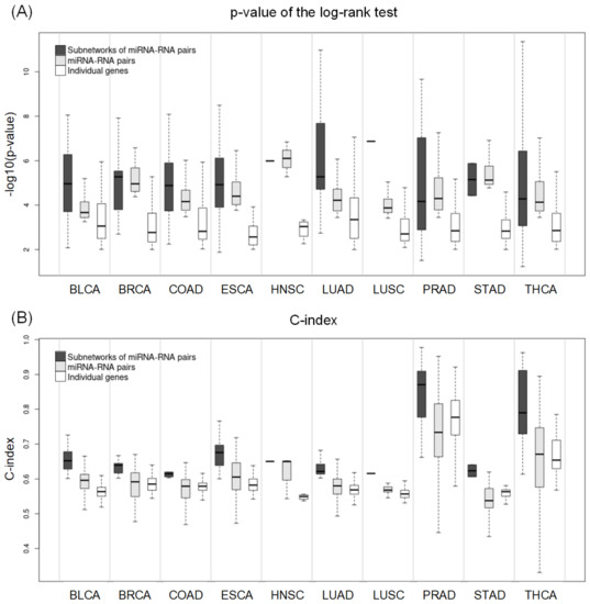 Figure 5 shows the distribution of p-values of the log–rank test and C-index values of networks of miRNA–RNA pairs, miRNA–RNA pairs, and individual genes. In most cancer types, the best p-values, and C-indices were observed in network biomarkers, followed by miRNA–RNA pairs. In particular, the superiority of network biomarkers was prominent in C-index.