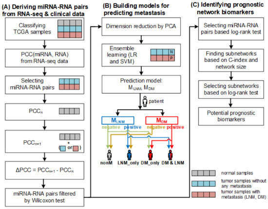 The overall framework of our method. (A) Deriving miRNA–RNA pairs based on PCC from RNA–seq and clinical data. (B) Constructing prediction two models for predicting metastasis (LNM and DM) based on differential correlations between miRNAs and their target RNAs and predicting metastasis using the models. (C) Identifying prognostic network biomarkers from miRNA–RNA pairs.