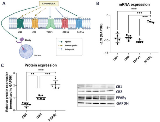 Recent reports have shown that the effects of CBD are mediated not only by the binding and activation of its best known targets, the cannabinoid receptors CB1 and CB2, but also by several other CBD-related receptors, such as the nuclear peroxisome proliferator-activated receptor gamma (PPARγ), the transient receptor potential vanniloid 1 (TRPV1) channel, the G protein-coupled receptor GPR55, and the 5-HT1A serotonin receptors [44,45,46,47] (Figure 1A).
