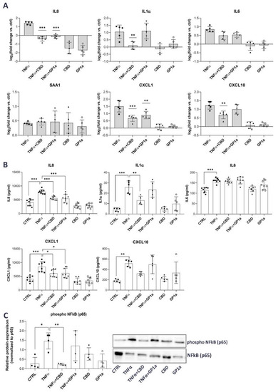To determine the potential mechanism by which CBD and GP1a may confer the observed anti-inflammatory effects, we next investigated the phosphorylation of NFκB, a known signaling pathway downstream of TNFα-stimulation [49]. In the absence of stimuli, NFκB is associated with IκBα, and therefore not activated. TNFα causes the degradation of IκBα and enables the activation of NFκB through phosphorylation [50]. In our model, we observed increased phosphorylation of the NFκB p65 subunit stimulated by TNFα, whereas CBD was able to significantly reduce this TNFα-mediated effect (Figure 3C). The relative protein expression of phosphorylated NFκB p65 subunit was normalized to the levels of unphosphorylated p65 (Figure 3C), as well as GAPDH (Supplemental Figure S3), showing the same statistical differences. No significant effect on NFκB phosphorylation was observed in the presence of GP1a (Figure 3C).