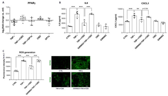 The supernatants of SV-HUC1 cells, seeded in 12- or 24-well plates and treated with/without TNFα, CBD, GP1a and/or PPARγ receptor inhibitor GW9662 for 24 h, were collected, centrifuged (200× g, 5 min, RT) and stored at −80 °C until analysis. Enzyme-linked immunoassays (ELISA) were performed using commercial ELISA kits in duplicates, according to manufacturer’s instructions. Absorbance at 450 nm with a reference wavelength set at 570 nm was measured on a microplate reader (Safire; Tecan, Mannedorf, Switzerland). The following ELISA kits were used in the present study: human IL8 ELISA MAX™ Deluxe Set, human IL1α MAX™ Deluxe Set, human CXCL10 ELISA MAX™ Deluxe Set (all Bio Legend, San Diego, CA, USA), human CXCL1 Duo Set Kit (R&D Systems, Minneapolis, MN, USA), and human IL6 ELISA Kit (Cayman Chemicals, Ann Arbor, MI, USA).