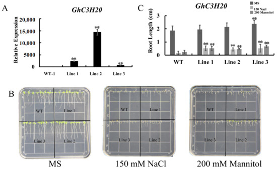 2.4. Overexpression of GhC3H20 Enhances Salt and osmotic Stress Tolerance in Transgenic Arabidopsis Seedlings