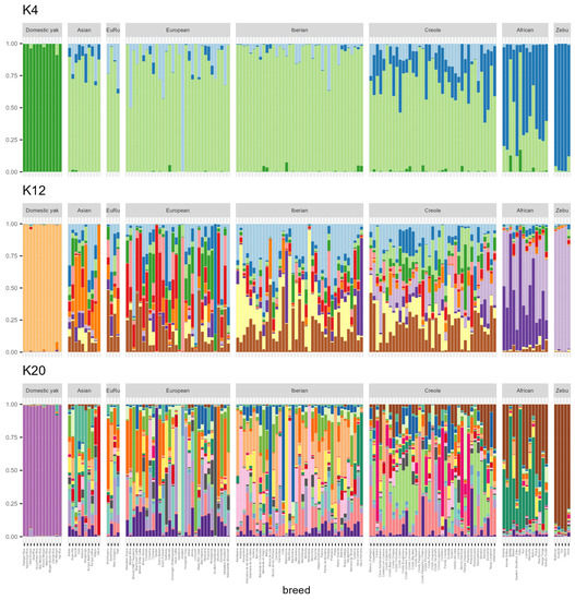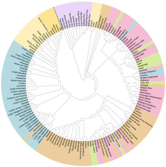 - MacHugh, D.E.; Shriver, M.D.; Loftus, R.T.; Cunningham, P.; Bradley, D.G. Microsatellite DNA Variation and the Evolution, Domestication and Phylogeography of Taurine and Zebu Cattle (Bos taurus Bos indicus). Genetics 1997, 146, 1071–1086. [Google Scholar] [CrossRef]