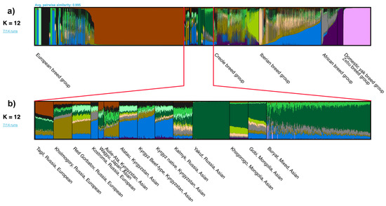 Solodneva, E.; Svishcheva, G.; Smolnikov, R.; Bazhenov, S.; Konorov, E.; Mukhina, V.; Stolpovsky, Y. Genetic Structure Analysis of 155 Transboundary and Local Populations of Cattle (Bos taurus, Bos indicus and Bos grunniens) Based on STR Markers. Int. J. Mol. Sci. 2023, 24, 5061. https://doi.org/10.3390/ijms24055061