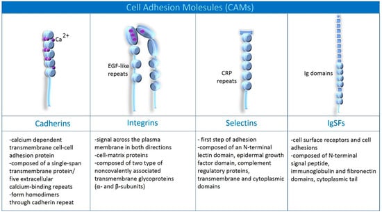 - Cancer–One of the CAMs that plays a vital role in cancer is cadherins []. It was shown that the E-cadherin-catenin complex is a fundamental part of epithelial monolayers, upholding homeostasis and maintenance []. Losing E-cadherins results in cancer progression []. One of the mechanisms in that action is the formation of mature junctions that suppress tumor invasion []. Furthermore, a loss of E-cadherins releases cellular signals that promote tumor growth and infiltration, e.g., Rho GTPases, PI3K et cetera []. The significant role of selectins in tumorigenesis and inflammation has also been demonstrated [,]. Selectins, via adhesive mechanisms, protect the organism from bacterial infections and are involved in trafficking cells of the innate immune system, T lymphocytes, and platelets []. E-selectin expression increases up to 6 h after inflammatory stimuli, e.g., interleukin-1 []. The mechanism selectins utilize is a rolling adhesion through selectin-ligand interactions, described in detail by McEver []. Selectins’ role in tumorigenesis has also been established [,]. They facilitate the hematogenous dissemination of tumor cells and their arrest in the microvasculature by activating adhesive mechanisms between selectin-expressing host cells and ligands of tumor cells [].