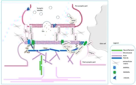 CAMs not only act as linkers between cellular elements of the central nervous system, as we may think intuitively but also actively participate in the transmission of signals between neurons and in synaptic plasticity, as has been scientifically documented [,,]. A synapse consists of a presynaptic part, a cleft, and a postsynaptic element. The presynaptic and postsynaptic components communicate by releasing neurotransmitters and gating ion channels of receptors located postsynaptically []. CAMs also play their vital role here. Not only do they form connections between synapse elements interacting in a homophilic and heterophilic manner across the synaptic gap, but they are also involved in the transmission of signals through cellular domains and connections to scaffolding and actin proteins [,,]. Synaptically localized adhesion molecules (SAMs) can modify the formation of synapses, modulate the morphology of dendritic spines, influence the function of synaptic receptors and regulate synaptic plasticity []. Trans-synaptic signaling in synaptogenesis is mediated via Neurexins/neuroligins, SynCAMs, SALM2, and NGL2; which may induce postsynaptic differentiation via the direct association with postsynaptic density protein 95 (PSD-95) via PDZ binding domain interactions (results in vitro and also in vivo). The leading role of PSD-95 in synaptic transmission, synaptic plasticity, and morphological remodeling was described by Stachowicz []. EphBs/ephrin-Bs communicate through direct extracellular interactions of EphB2 with NMDARs and AMPARs through the PDZ-binding domain []. Subsequently, N-cadherin can bind PSD-95 clusters with cadherin signaling inhibition and interact with AMPARs []. On the other hand, presynaptically induced differentiation by neurexins/neuroligins and SynCAM are connected with the CASK/MINT association [,]. The functional and structural localization of CAMs at the synapse is shown in Figure 3.