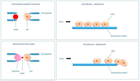 Schematic of selected methods of adhesion detection (micropipette aspiration technique, bio-plasma force probe), including the mechanism of cell attachment and detachment-overview figure. A detailed description of the methods presented can be found in [,].