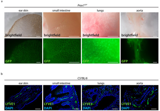 - Choi, I.; Chung, H.K.; Ramu, S.; Lee, H.N.; Kim, K.E.; Lee, S.; Yoo, J.; Choi, D.; Lee, Y.S.; Aguilar, B.; et al. Visualization of lymphatic vessels by Prox1-promoter directed GFP reporter in a bacterial artificial chromosome-based transgenic mouse. Blood 2011, 117, 362–365. [Google Scholar] [CrossRef]