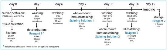 Our tissue-clearing protocol was 15 days long and consisted of the following main elements: a transcardial perfusion, tissue collection and post-fixation on day 0, decolorization for 5 days with Reagent 1, whole-mount immunostaining with the primary and secondary antibodies in Staining Solutions 1 and 2 and an RI-adjustment step in which the refraction indices of the cellular compartments were matched overnight in Reagent 2 (Figure 2).