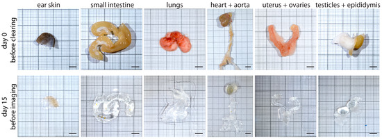 With this approach, we could successfully clear various mouse organs with everyday lab equipment. We tested our protocol with the ear skin, small intestine, lungs, heart with aorta, uterus with ovaries and testicles with epididymis and achieved a high level of transparency in all cases (Figure 3).