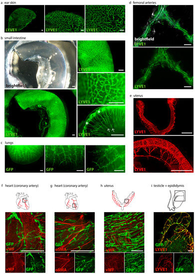 Visualization of organ-specific lymphatic vasculature. (a) Lymphatic vasculature of the ear skins of adult C57BL/6 mice. Samples were stained with anti-LYVE1. Pictures were taken with a stereo microscope, scale bar 500 μm (n = 3 skin samples of 3 mice). (b) Lymphatic vasculature of the intestines of adult C57BL/6 mice. Samples were stained with an anti-LYVE1 antibody. Villi intestinales are marked with arrows, the submucosal area is marked with asterisks. Pictures were taken with stereo microscopy, scale bar 500 μm (n = 3 small intestines of 3 mice). (c) Lymphatic vasculature of the lungs of adult Prox1GFP mice. Samples were stained with an anti-GFP antibody. Pictures were taken with stereo microscopy, scale bar 500 μm (n = 3 lungs of 3 mice). (d) Lymphatic vasculature of the femoral arteries of adult C57BL/6 mice. Samples were stained with an anti-LYVE1 antibody. Pictures were taken with stereo microscopy, scale bar 5000 μm (n = 6 femoral arteries of 6 mice). (e) Lymphatic vasculature of the uterus of adult C57BL/6 mice. Samples were stained with an anti-LYVE1 antibody. Pictures were taken with stereo microscopy, scale bar 2500 μm (n = 3 uteri of 3 mice). (f) Lymphatic vasculature of a coronary artery. Sample was stained with an anti-GFP antibody and anti-von Willebrand Factor (vWF). Pictures were taken with confocal microscopy, scale bar 500 μm (n = 1 coronary artery). (g) Lymphatic vasculature of the coronary artery of an adult Prox1GFP mouse. Sample was stained with an anti-GFP antibody and the smooth muscle marker anti-α-smooth muscle actin (αSMA). Pictures were taken with confocal microscopy, scale bar 500 μm (n = 1 coronary artery). (h) Lymphatic vasculature of the uteri of adult Prox1GFP mice. Samples were stained with anti-GFP and anti-vWF antibodies. Pictures were taken with confocal microscopy, scale bar 500 μm (n = 2 uteri of 2 mice). (i) Lymphatic vasculature of the testicle and epididymis of an adult Prox1GFP mouse. Sample was stained with anti-LYVE1 and with an anti-GFP antibody. Images were captured with confocal microscopy, scale bar 500 μm (n = 1 testicle with epididymis). Representative images of the experiments are shown.