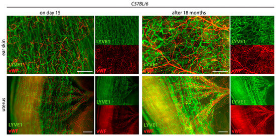Long-term stability of the fluorescence signal. The tissue-cleared and stained ear skins and uteri of C57BL/6 mice are shown on day 15 at the end of the tissue-clearing protocol and 18 months later. Samples were stained with the lymphatic marker anti-LYVE1 and anti-von Willebrand Factor (vWF). Samples were stored at 4 °C in Reagent 2. Images were acquired by stereo microscopy, scale bar 500 μm (n = 3 organs of 3 mice). Representative images of the experiments are shown.