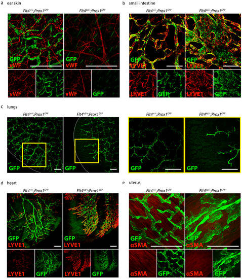 Visualization of the organ-specific lymphatic vasculature of Flt4kd/+ mice. (a) Lymphatic vasculature of the ear skins of adult Flt4+/+; Prox1GFP and Flt4kd/+; Prox1GFP mice. Ears were stained with an anti-GFP antibody and anti-von Willebrand Factor (vWF). Images were acquired by confocal microscopy, scale bar 500 μm (n = 5 ears of 5 mice per group). (b) Lymphatic vasculature of the small intestines of adult Flt4+/+; Prox1GFP and Flt4kd/+; Prox1GFP mice. Intestines were stained with an anti-GFP antibody and anti-LYVE1. Pictures were taken with confocal microscopy, scale bar 500 μm (n = 6 small intestines of 6 mice per group). (c) Lymphatic vasculature of the lungs of adult Flt4+/+; Prox1GFP and Flt4kd/+; Prox1GFP mice. Lungs were stained with an anti-GFP antibody. Images were taken with a confocal microscope, scale bar 500 μm (n = 3–4 lungs of 3–4 mice per group). (d) Lymphatic vasculature of the hearts of adult Flt4+/+; Prox1GFP and Flt4kd/+; Prox1GFP mice. Hearts were stained with an anti-GFP antibody and anti-LYVE1. Images were taken with confocal microscopy, scale bar 500 μm (n = 3–4 hearts of 3–4 mice per group). (e) Lymphatic vasculature of the uteri of adult Flt4+/+; Prox1GFP and Flt4kd/+; Prox1GFP mice. Uteri were stained with an anti-GFP antibody and anti-alpha smooth muscle actin (αSMA). Images were acquired by confocal microscopy, scale bar 250 μm (n = 3–4 uteri of 3–4 mice per group). Representative images of the experiments are shown.