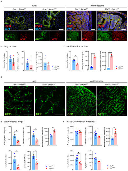 To highlight the advantages of our approach, we tissue-cleared and stained lungs and small intestines of Flt4+/+; Prox1GFP and Flt4kd/+; Prox1GFP mice and acquired confocal images of the samples (Figure 8d).