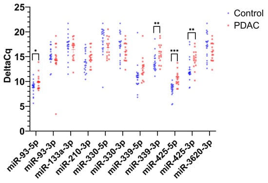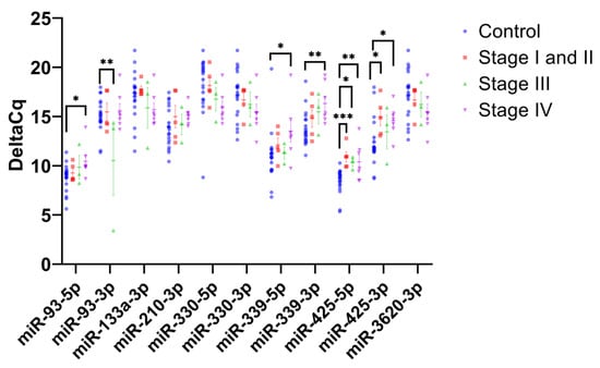 2.4. PDAC Stage-Specific Differences in Plasma Exosome miRNA Expression Levels