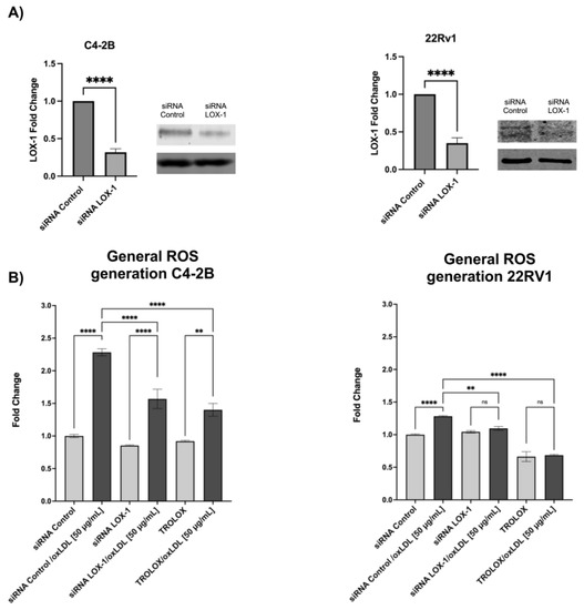 (A) Western blot of LOX-1 expression in CRPC cells, C4-2B and 22RV1 transfected with siRNA against LOX-1. To silence the LOX-1 RNA expression, C4-2B and 22RV1 prostate cancer cell lines were transfected with siRNA-LOX-1 or siRNA-control for 48 h, and the expression of LOX-1 was analyzed by Western blot. (B) OxLDL/LOX-1 induces ROS generation in castration-resistant prostate cancer cell models. C4-2B and 22Rv1 were transfected with a siRNA against LOX-1 or the control for 48 h or treated with 25 μM Trolox and then treated with 50 μg/mL oxLDL, and the ROS generation was analyzed 3 h post-treatment. The data represent the means ± S.D. of three independent experiments analyzed by one-way analysis of variance and Dunnett’s post-test or t-test for LOX-1 expression analysis (**** p ≤ 0.0001, ** p ≤ 0.01, ns: non-significant statistical difference).